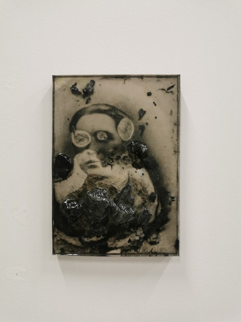 In her most recent series Amass (2025), she engages with archival materials from Colecția Costică Acsinte and the Muzeul Județean Ialomița, yet intervenes in these sources through the use of resin and charcoal. These materials veil the faces in the original photographs, resisting clarity and recognition. A skeletal metal structure supports part of the works, while distressed magnifying lenses further disrupt the act of viewing. As the viewer peers through these lenses, only fractured, elusive fragments come into focus—underscoring the limits of both memory and visibility.